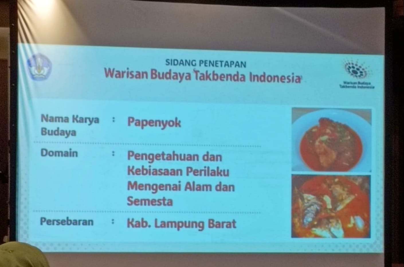 Penjabat (Pj) Bupati Lampung Barat Drs. Nukman M.M sampaikan rasa bangganya sebab, warisan budaya Papenyok dan Celugam berasal dari Kabupaten Lampung Barat resmi direkomendasikan dalam daftar Warisan Budaya Tak Benda (WBTB) Indonesia pada sidang penetapan WBTB Indonesia 2024 yang berlangsung di Hotel Holiday Inn dan Suite Jakarta, Kamis malam, 22 Agustus 2024.