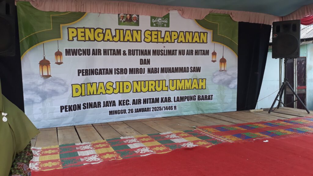 Pengajian Selapanan Keluarga Besar Nahdlatul Ulama (KBNU) Kecamatan Air Hitam Lampung Barat pada tanggal Ahad 26 /1 /2025 diselenggarakan di Masjid Nurul Ummah Pekon (desa) Sinar Jaya Kecamatan Air Hitam . Pengajian kali ini selain merupakan Selapanan MWCNU Air Hitam juga merupakan Rutinan Muslimat NU Air Hitam . Pengajian selapanan ini mendatangkan pengisi kajian Ustad Andrihuna ( dari Bukit Kemuning Kabupaten Lampung Utara).