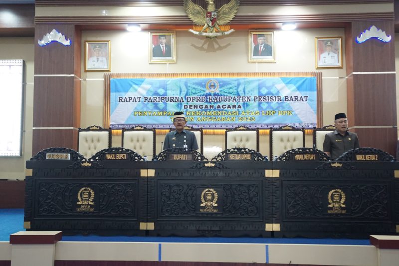 Bupati Pesisir Barat (Pesibar), Dr. Drs. Agus Istiqlal, S.H., M.H., menghadiri rapat paripurna Dewan Perwakilan Rakyat Daerah (DPRD) Pesibar dengan agenda penyampaian rekomendasi atas Laporan Hasil Pemeriksaan (LHP) Badan Pemeriksa Keuangan (BPK) Tahun Anggaran 2023, di ruang rapat paripurna DPRD Pesibar, Rabu (10/7/2024).