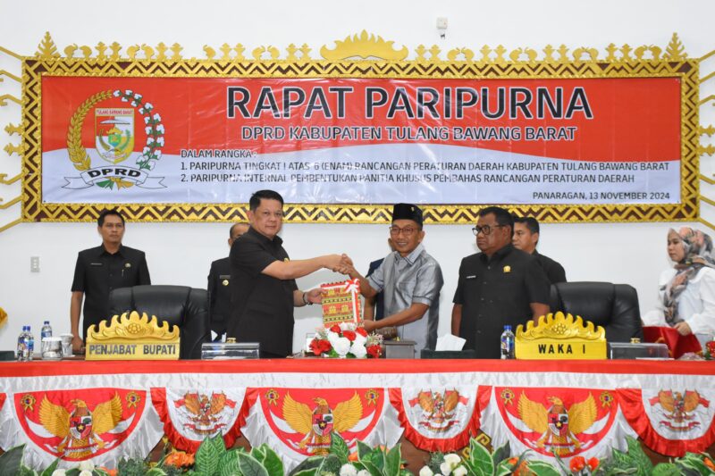 Penjabat (Pj) Bupati Tulang Bawang Barat (Tubaba) Drs. M. Firsada, M.Si., sampaikan 3 Rancangan Peraturan Daerah (Raperda) Inisiatif DPRD dan 3 Raperda Kabupaten Tubaba pada Rapat Paripurna DPRD Pembicaraan Tingkat I atas 6 Raperda Kabupaten Tubaba. Di Ruang Paripurna DPRD setempat. Rabu (13/11/2024).