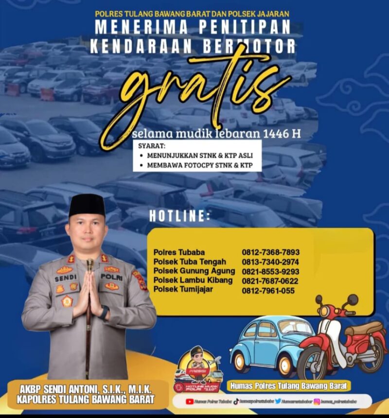 “Kami ingin memastikan masyarakat dapat mudik dengan tenang tanpa khawatir akan keamanan kendaraan atau barang berharganya. Oleh karena itu, kami menyediakan tempat penitipan yang aman di Polres muapun di Polsek Jajaran Polres Tubaba,” ujar AKBP Sendi Antoni, S.I.K.,M.I.K, Kamis (27/3/2025).