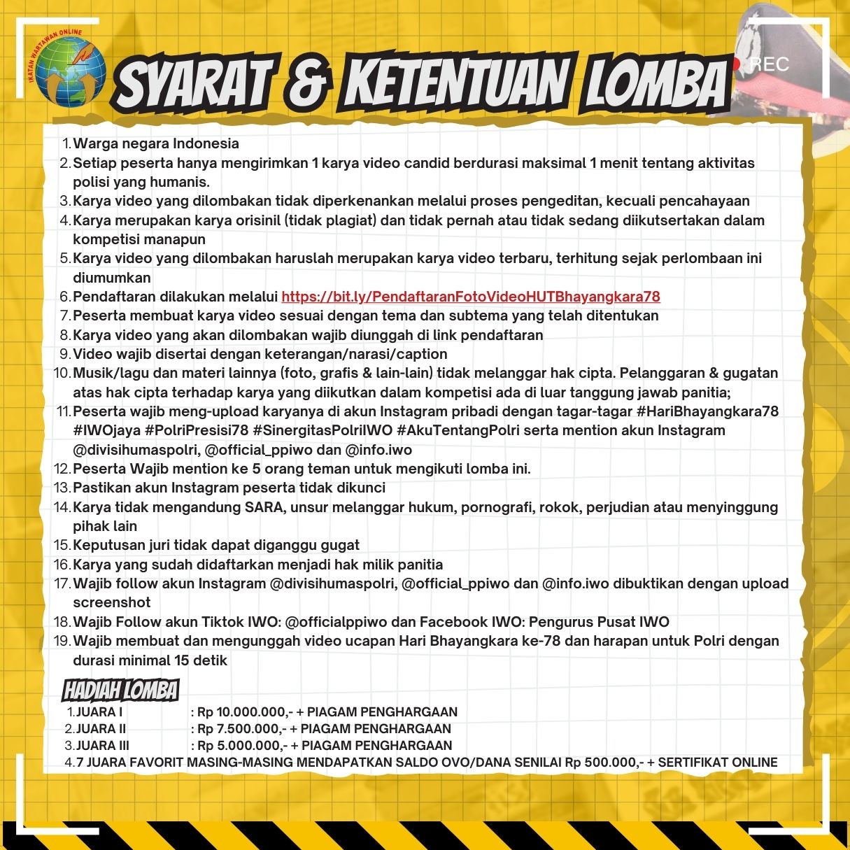 “Semua syarat dan ketentuan lomba bisa dilihat flyer yang sudah dishare secara resmi oleh PP IWO,” pungkasnya.
